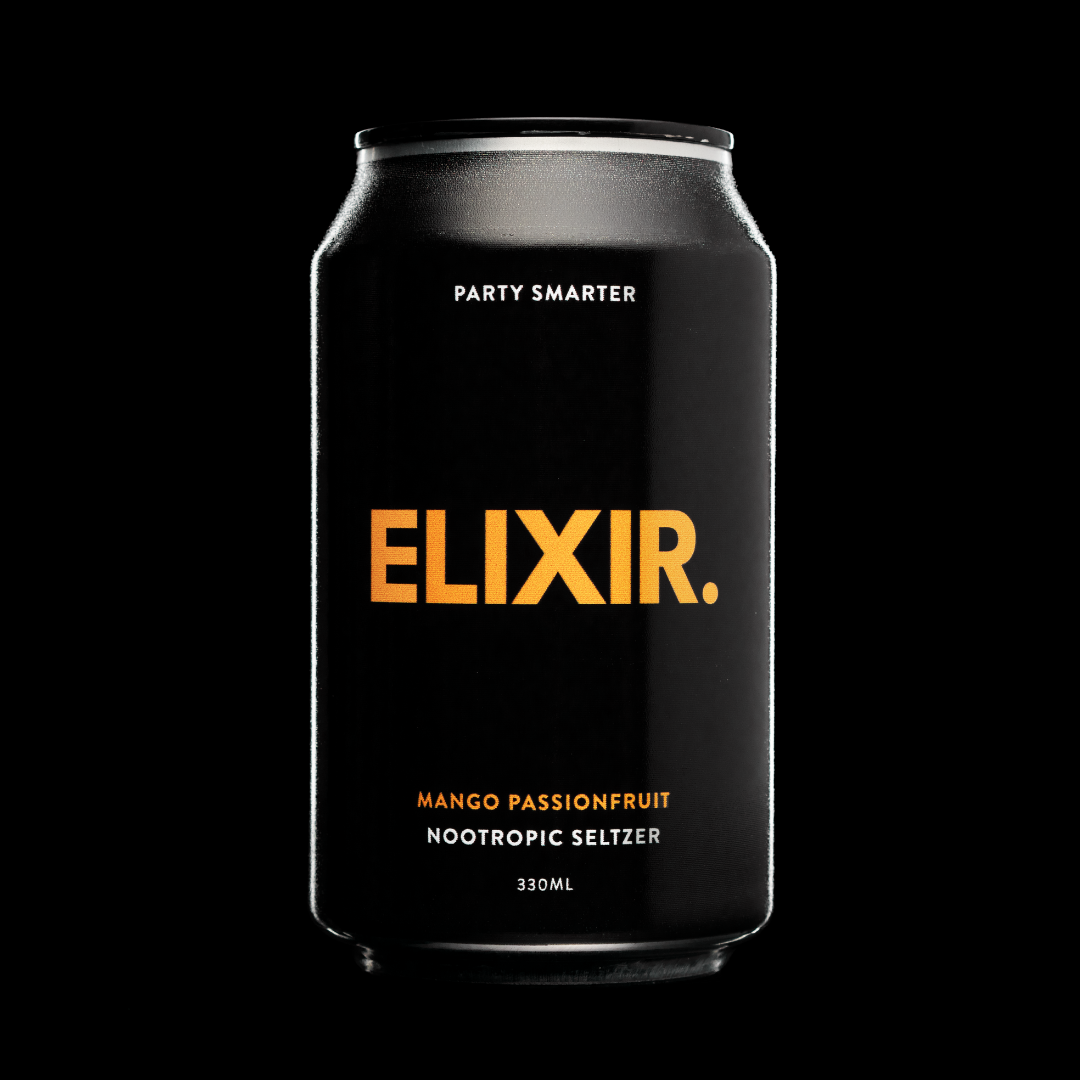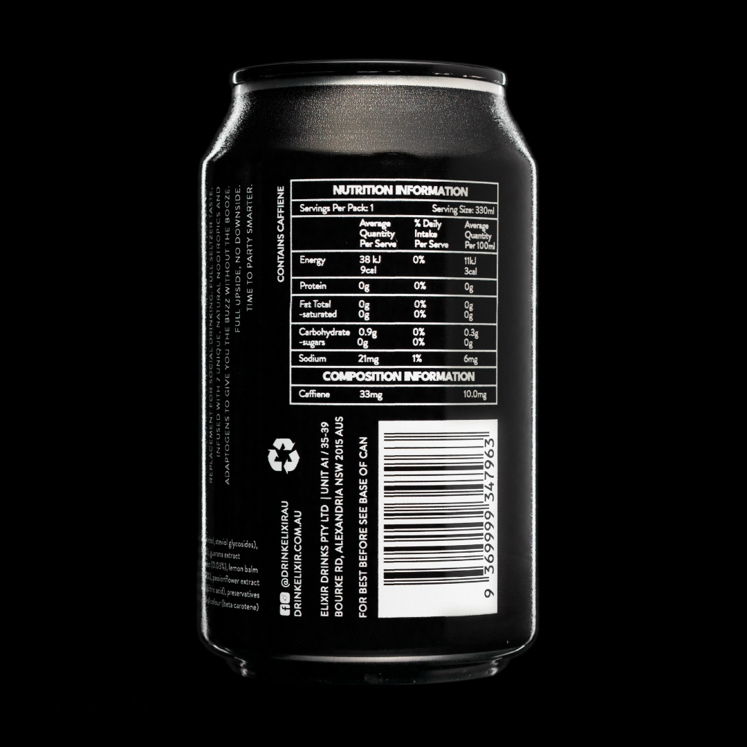 ELIXIR is a combination of Australian sparkling water infused with natural Australian nootropics and adaptogens, L-Theanine, Passionflower, Oat Straw Extract, Ginseng, Guarana, Lemon Balm Extract and Valerian Root Extract to provide your mind and body with the ultimate social drinking experience.